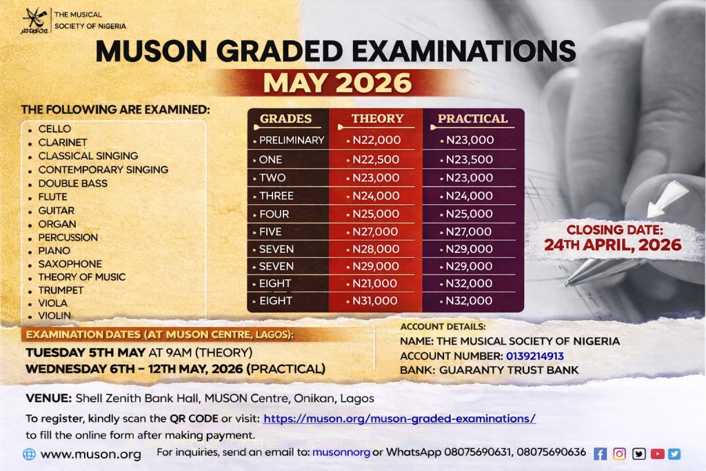 Dear All, Kindly note that GTBank is transitioning and this has made transaction difficult. For MUSON graded exam payment please pay to an alternative MUSON Account: